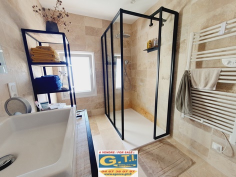 salle d’eau avec douche à l’italienne et travertin,